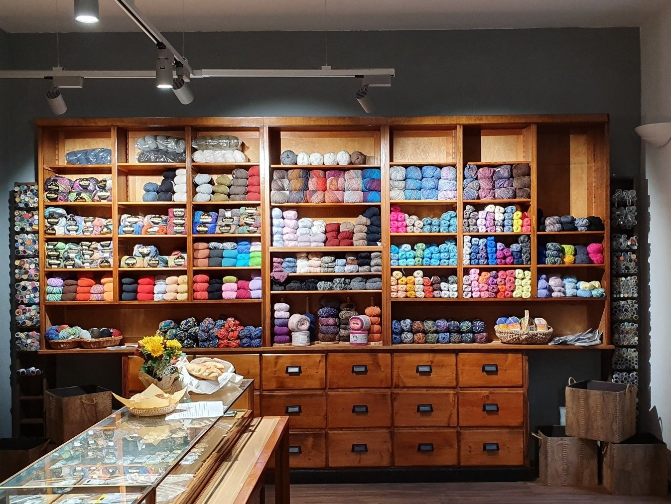 Auch andere Einrichtungsteile stammen entweder aus Familienbesitz oder wurden gebraucht erworben. Es sind sorgfältig ausgewählte Stücke, die den Charakter unseres Ladens ausmachen, für die einzigartige Atmosphäre unseres Ladengeschäfts sorgen und in besonders schöner Form moderne Garne aus den neuesten Kollektionen präsentieren.